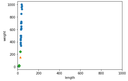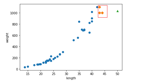 농어의 길이가 50이나 되는데 최근접 이웃인 45보다 작은 농어의 평균 값을 50cm짜리 농어의 무게로 예측한다.