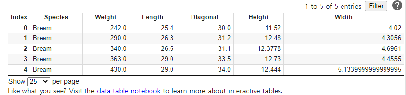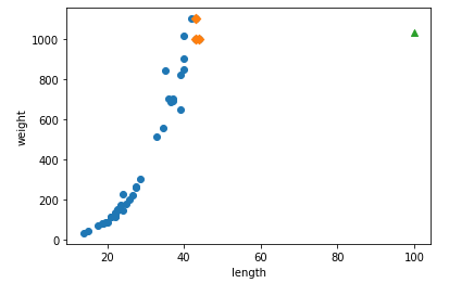 농어의 길이가 50이나 되는데 최근접 이웃인 45보다 작은 농어의 평균 값을 50cm짜리 농어의 무게로 예측한다.