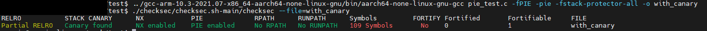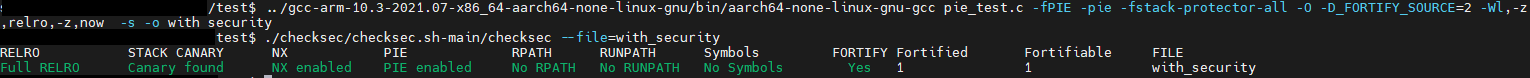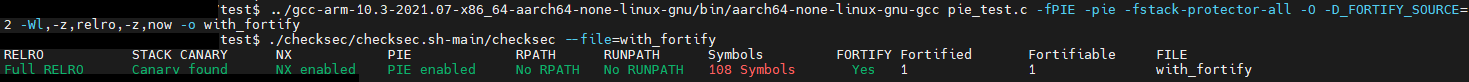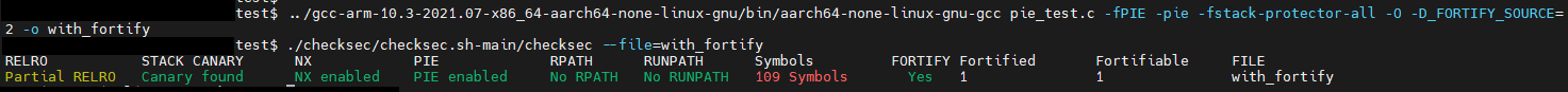 test$ aarch64-none-linux-gnu-gcc pie_test.c -fPIE -pie -fstack-protector-all -O -D_FORTIFY_SOURCE=2 -Wl,-z,relro,-z,now -o with_fortify